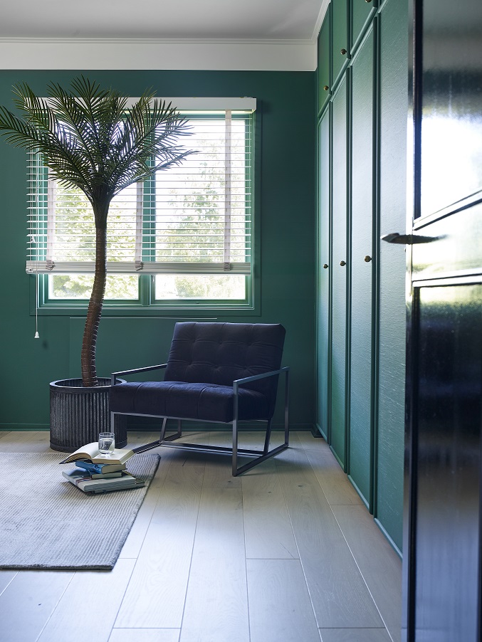 Slå deg løs med farger. De behøver ikke lenger gli sømløst sammen med naborommet. Grønnfargen er også en god farge for øynene å lese bøker i. Denne fargen heter Beatle FR1461. Foto: Per Erik Jæger/Fargerike, Stylist: Siv Brenne.